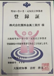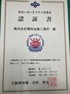 この度、株式会社関西金属工業所は、大阪府より「男女いきいき・元気宣言」事業者ならびに、そのステップアップ版である「男女いきいきプラス」事業者として登録・認証されました。 私たちは、女性の活躍推進や仕事と家庭の両立支援など、男女ともに働きやすい環境づくりに取り組んでいます。 これからも社員一人一人がいきいきと力を発揮できるよう、さらなる環境づくりに努めてまいります。
